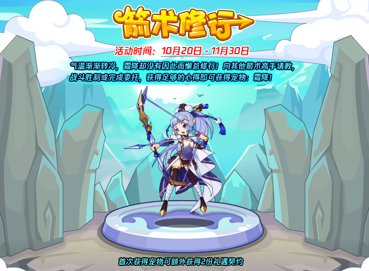 气温渐渐转冷,霜降却没有因此而懈怠修行!向其它箭术高手请教,战斗胜利或完成委托,获得足够的心得即可获得宠物:霜降!