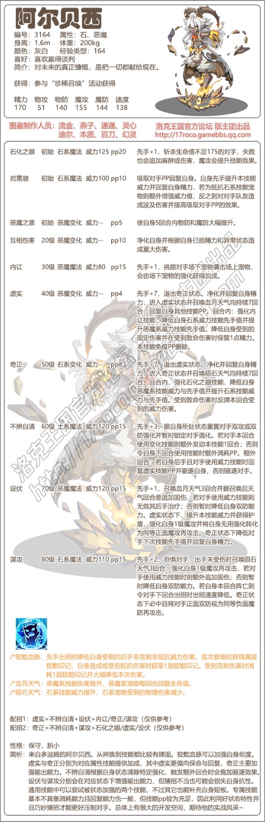 今日给大家带来了《洛克王国》阿尔贝西技能表图鉴分享,分享技能表种族值可以让大家快速了解这个宠物各项信息,来自多迪姆的阿尔贝西,从种族到技能都比较有牌面,狡黠血脉可以加强自身坦度。虚实与奇正分别为对应属性技能提供加成,其中虚实更偏向保命与回复,奇正主要加强输出能力。