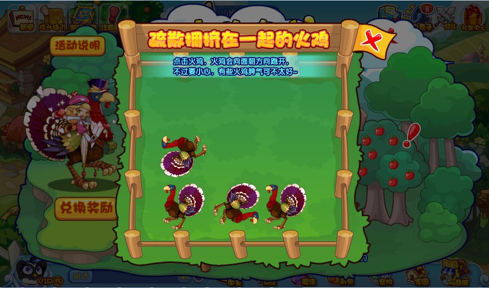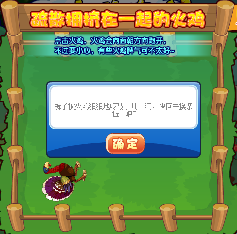 将围栏内拥挤的火鸡进行疏散即可,火鸡会自动朝面向方向跑开,点击错误系统会提示,这个没啥难度,但是如果火鸡暴走,就会触发与特坑进行挑战,战胜即可。