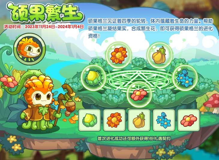 每种硕果各一个可合成一朵繁生花,收集13朵繁生花即可获得宠物“硕果格兰”的进化资格以及礼遇契约*1。