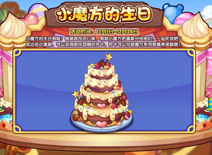 小魔方的生日到啦!根据居民的口味,帮助小魔方把蛋糕分给他们,一起庆祝吧!成功送达蛋糕,可以获得居民回赠的贺卡。贺卡可以兑换魔方系列家具等奖励哦!