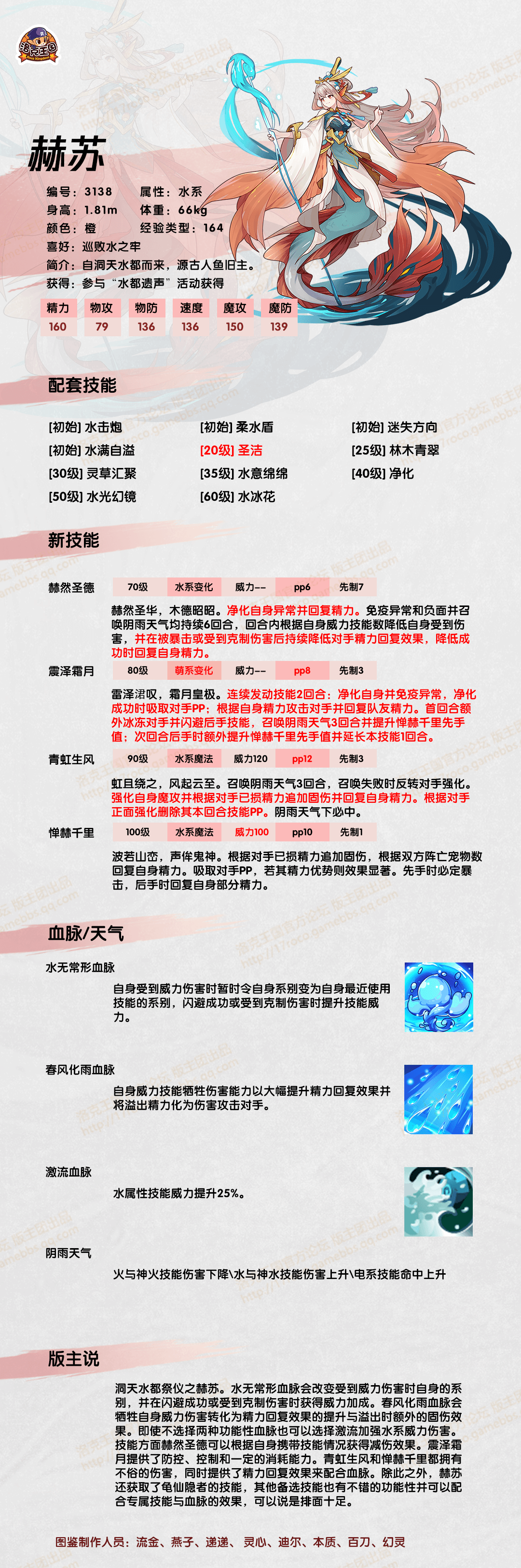 今日给大家带来了《洛克王国》赫苏技能表图鉴分享, 这是编号3138水系的魔攻宠物,巡败水之牢,自洞天水都而来,源古人鱼旧主。。下面分享技能表种族值可以让大家快速了解这个宠物各项信息,感兴趣的速来围观吧!