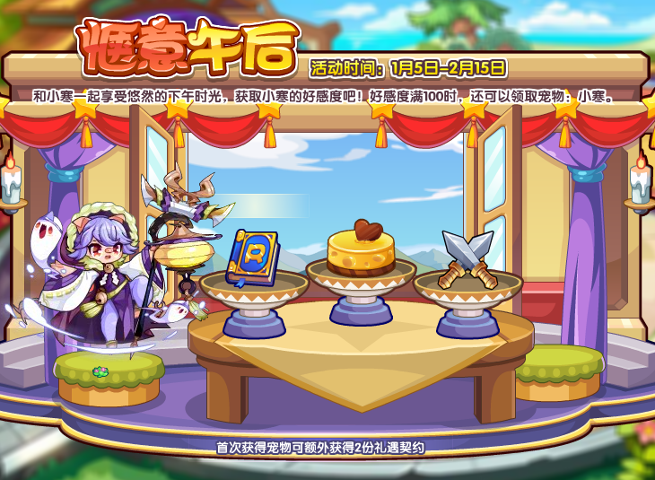 和小寒一起享受悠然的下午时光,获取小寒的好感度吧!好感度满100时,还可以领取宠物:小寒。