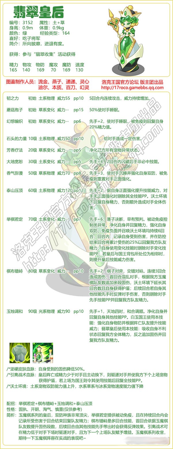 1、洛克王国翡翠皇后技能配招:举棋若定+棋布错+玉烛调和+泰山压顶