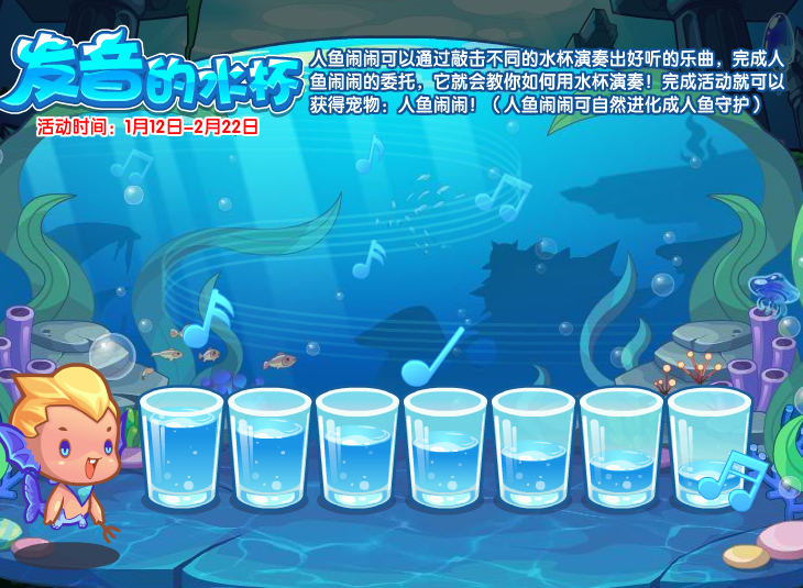 人鱼闹闹可以通过敲击不同的水杯演奏出好听的乐曲,完成人鱼闹闹的委托,它就会教你如何用水杯演奏!完成活动就可以获得宠物:人鱼闹闹!(人鱼闹闹可自然进化成人鱼守护)