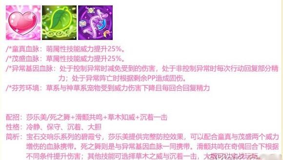 3、宝石交响乐系列的碧霞兮,莎乐美提供完整防控效果,可以配合童真与茂盛两个威力增伤的血脉携带。死之舞则是与异常基因血脉一同携带。