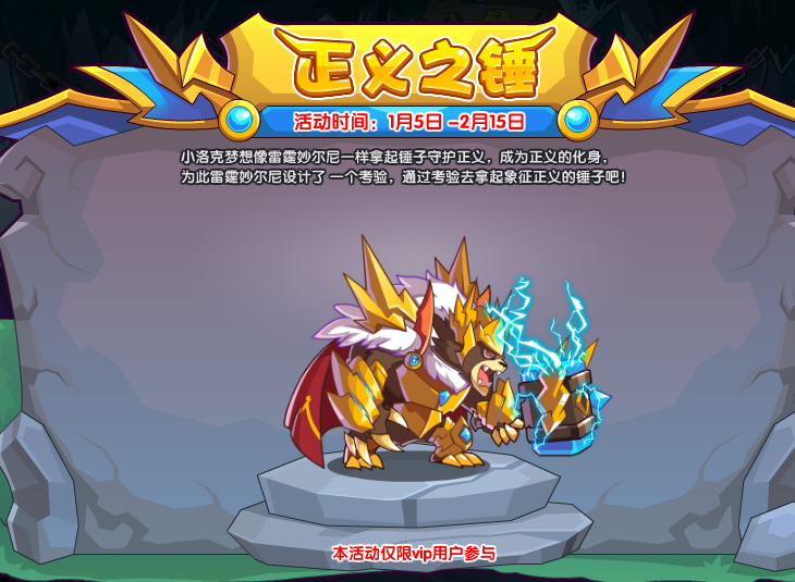 小洛克梦想像雷霆妙尔尼一样拿起锤子守护正义,成为正义的化身,为此雷霆妙尔尼设计了一个考验,通过考验去拿起象征正义的锤子吧!(本活动仅限vip用户参与)