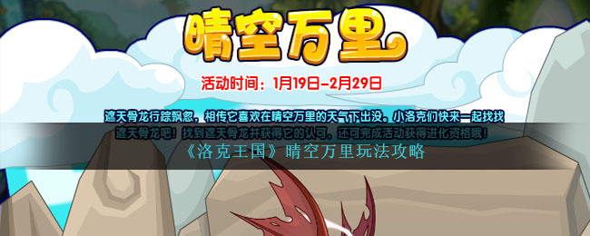 洛克王国晴空万里活动在2024年1月19日-2月29日上线,本活动仅限VIP用户参与,活动需要在龙榻陋室地图进入,玩家寻找遮天骨龙,遮天骨龙出现在龙之秘境,天气越晴朗,找到遮天骨龙进行挑战的认可度会越高。下面是小编给大家带来的《洛克王国》晴空万里玩法攻略,感兴趣的小伙伴们一起来看看吧。