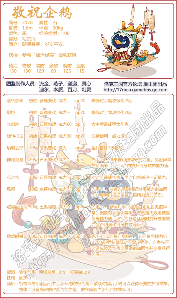4、祈福节与小洛克们共迎新年的敬祝企鹅。敬颂时祺后手时可以获得必要的护盾效果。整体上没有亮眼的种族与能力值,放在家园当新年吉祥物即可。