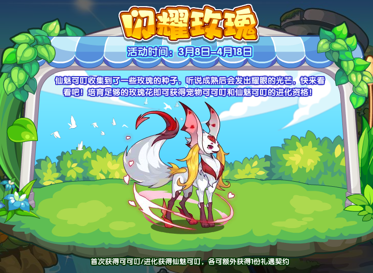 3、每天只需要培育一朵玫瑰花,培育三朵可领取:可可叮、培育四朵可解锁:仙魅可叮 超进化资格!