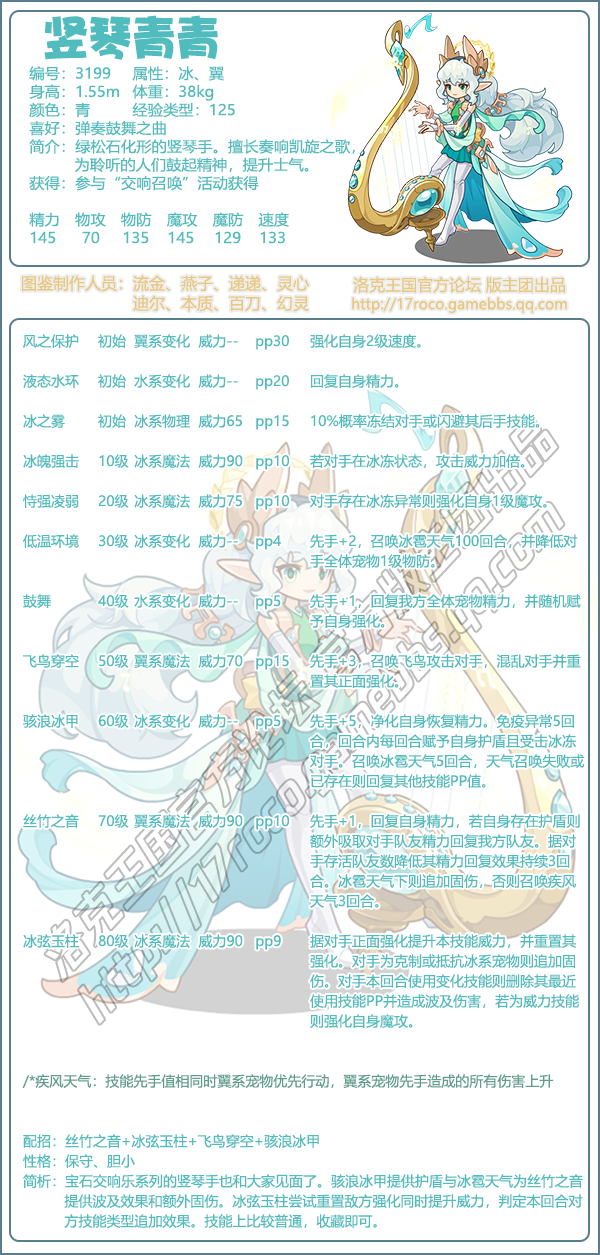 今日小编给大家带来了《洛克王国》竖琴青青技能表图鉴分享,这是编号3199的魔攻宠物,可以通过“交响名唤” 活动获得该宠物。下面小编给大家分享一下技能表种族值帮助大家快速了解这个宠物各项信息,感兴趣的速来围观吧!