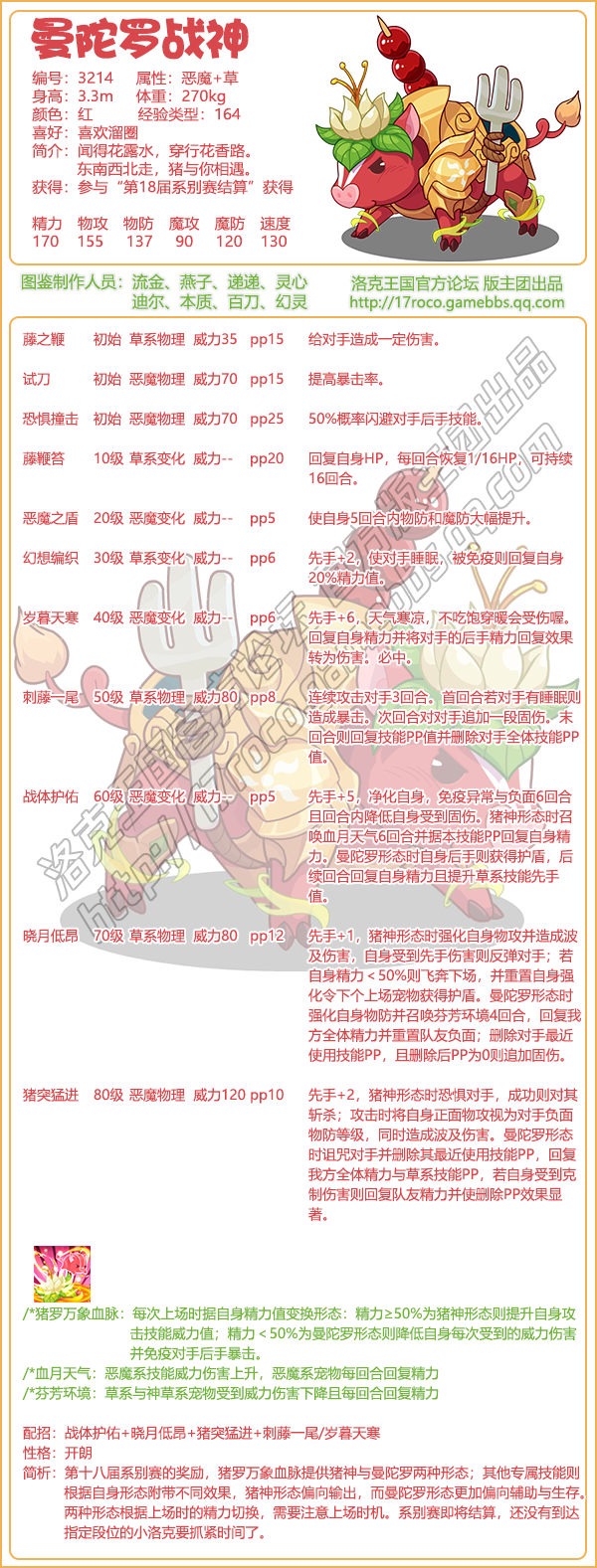 1、洛克王国曼陀罗战神技能配招:战体护佑+晓月低昂+猪突猛进+刺藤一尾/岁暮天寒