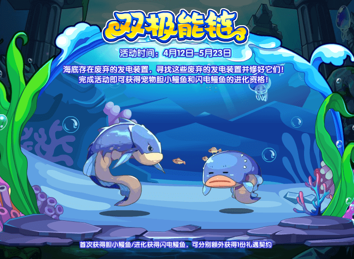 海底存在废弃的发电装置,寻找这些废弃的发电装置并修好它们!完成活动即可获得宠物胆小鳗鱼和闪电鳗鱼的进化资格!