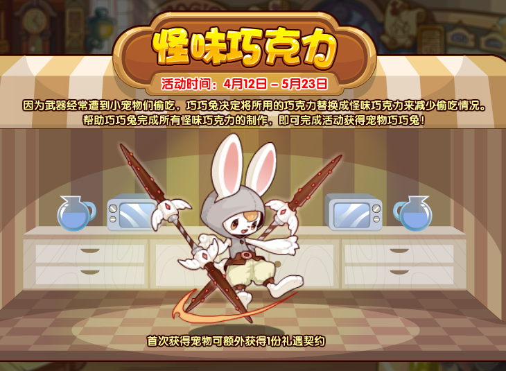 因为武器经常遭到小宠物们偷吃,巧巧兔决定将所用的巧克力替换成怪味巧克力来减少偷吃情况。帮助巧巧兔完成所有怪味巧克力的制作,即可完成活动获得宠物巧巧兔!