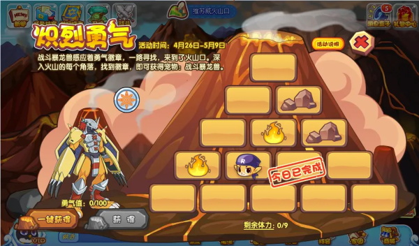洛克王国炽烈勇气活动开始了,战斗暴龙兽感应着勇气徽章,一路寻找,来到了火山口。玩法是通过相邻的区域移动探索,寻找勇气徽章,成功移动则消耗一点体力。探索过程会触发战斗,小洛克们请勇往直前!直到战斗胜利。下面是小编给大家带来的《洛克王国》炽烈勇气攻略2024,感兴趣的小伙伴们一起来看看吧。