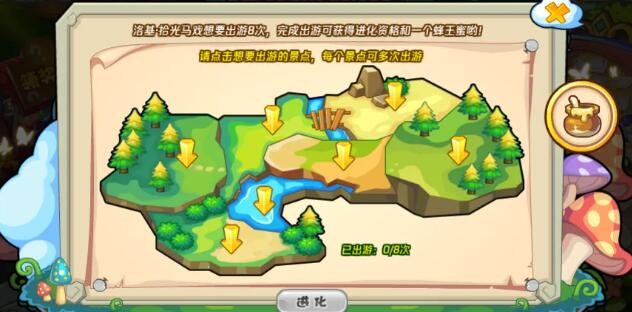 洛基·拾光马戏想要出游8次,我们可以在现有的7个景点中随意选择1个进行出游,同一景点可进行多次出游,每次出游需要消耗70洛克钻。累计出游次数满后即可获得洛基·拾光马戏的进化资格和1个蜂王蜜。本活动中最多可以获得4个蜂王蜜。