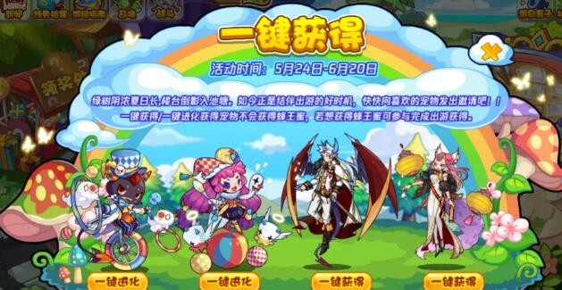 第一种是点击左上角的【一键获得】,进入一键界面。其中洛基·拾光马戏和安琪·星动马戏一键获得的是进化资格,需要准备满级的上一阶宠物,可通过鼠标悬停在宠物形象上查看上一阶宠物获得方式。溯夜帕尔和聆月妲己的一键为一键获得宠物,无需准备上一阶宠物。需要注意,一键获得/一键进化获得宠物不会获得蜂王蜜,若想获得蜂王蜜可参与完成出游获得。