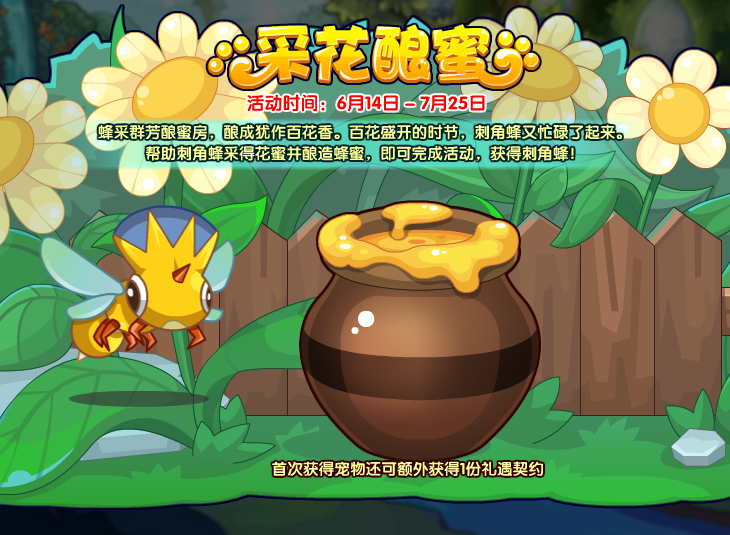 刺角蜂每天都会出现在真梦之园进行采蜜,小洛克们携带好6只主属性为虫系的宠物就找它进行助力吧。单次采蜜需要120秒,完成后可以获得7~10滴蜂蜜。