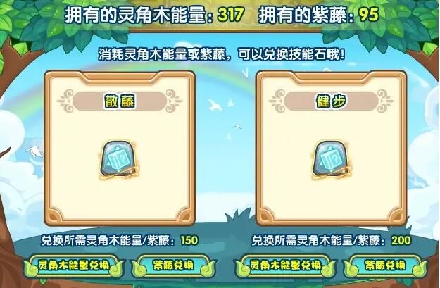 当然,还有很多小洛克关心独角兽的两个技能——散藤和健步的学习。现在,我们把这两个技能做成了技能石,小洛克可以通过消耗灵角木能量或消耗紫藤两种方式,来兑换技能石。而且,通过灵角木培育的独角兽,都可以使用散藤和健步技能石哦!