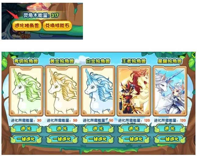 得到足够的灵角木能量后,就可以消耗灵角木能量进化独角兽了。现在,我们点击页面上的【进化独角兽】按钮,可以进入独角兽的进化页面。