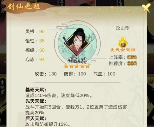 还有【吕洞宾】,其基础天赋可以加伤害,也是一个高输出的弟子,不过其天赋会减速度,这一点不太好。
