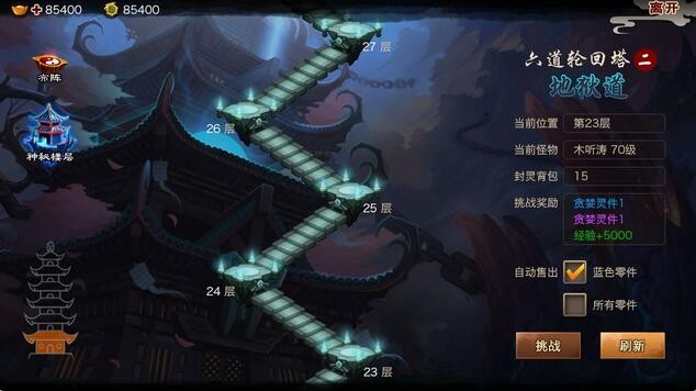 六道轮回是非常经典的爬塔系统,玩家依靠自身实力挑战每层的怪物获取奖励。奖励包括经验及封灵。