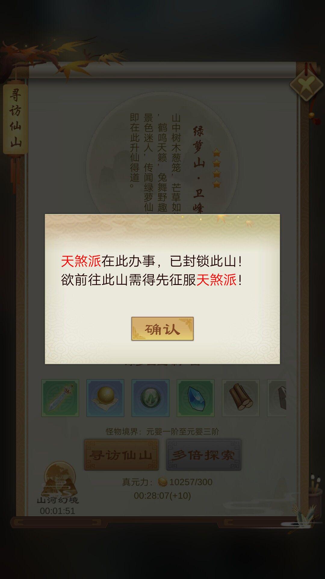 在解锁新的仙山之前,有的仙山会被个别门派占领或者封锁,这时候就需要先去征服这个门派才可以继续寻访仙山,从而解锁更好的资源。例如想探索绿萝山的话,就需要把封锁仙山的天煞派给征服。