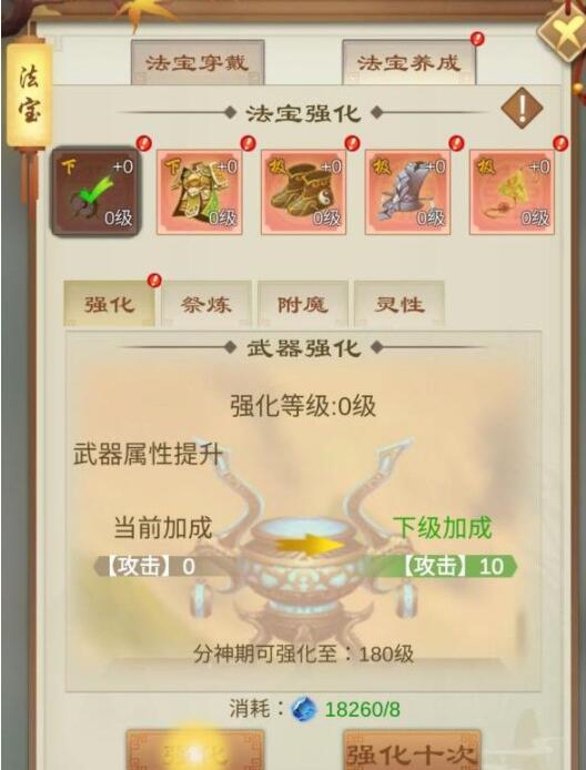 强化主要强化法宝的主要属性(一条),比如说武器就强化攻击、鞋子就强化闪避等等;