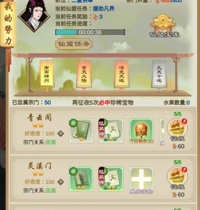 第二种方式就是向自己的臣服宗门征收资源,完成仙盟任务→获得宗门声望→消耗声望征收资源→有概率获得臣服宗门的修炼功法。