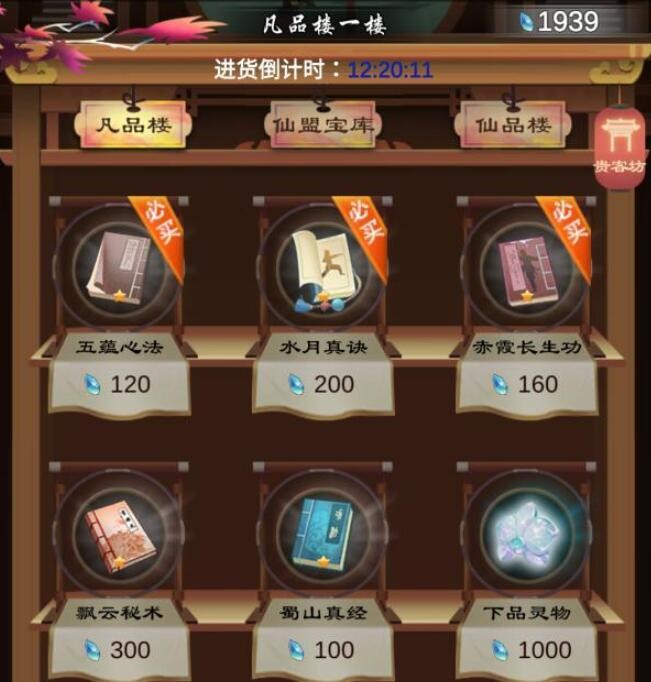 第一个可以在坊市中购买,每天凡品楼都会刷新标注“必买”的功法,其余功法视需求扫货,后续推图有可能获取到重复的,仙品楼同理。