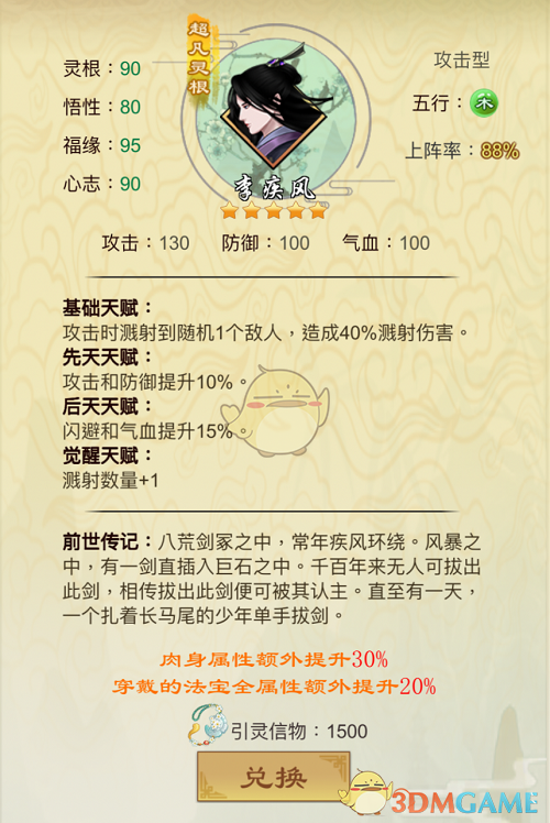万剑一每两回合攻击一次,造成300%的伤害,是全弟子中属性加成最高的。