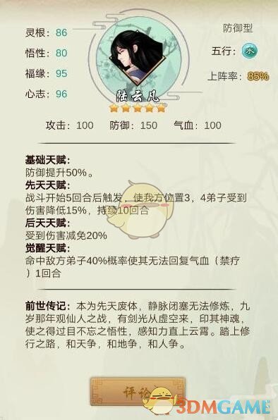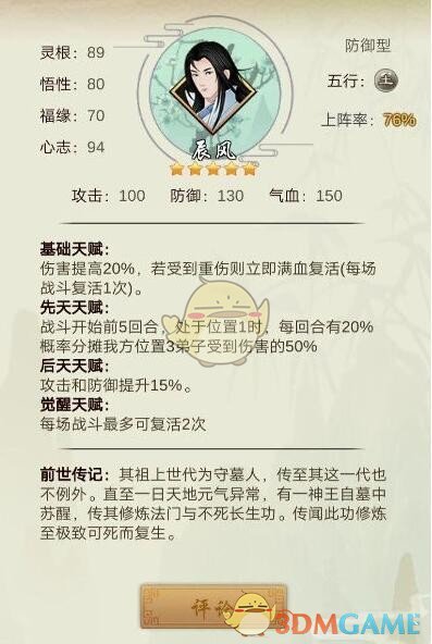 同时他的属性面板也很优秀,拥有130的防御和150的气血,而且在重伤之后可以立刻满血复活,等于有两条命。