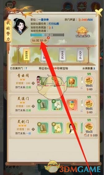 3、进入仙盟任务页面后,点击【升级】按钮即可提高仙盟职位!