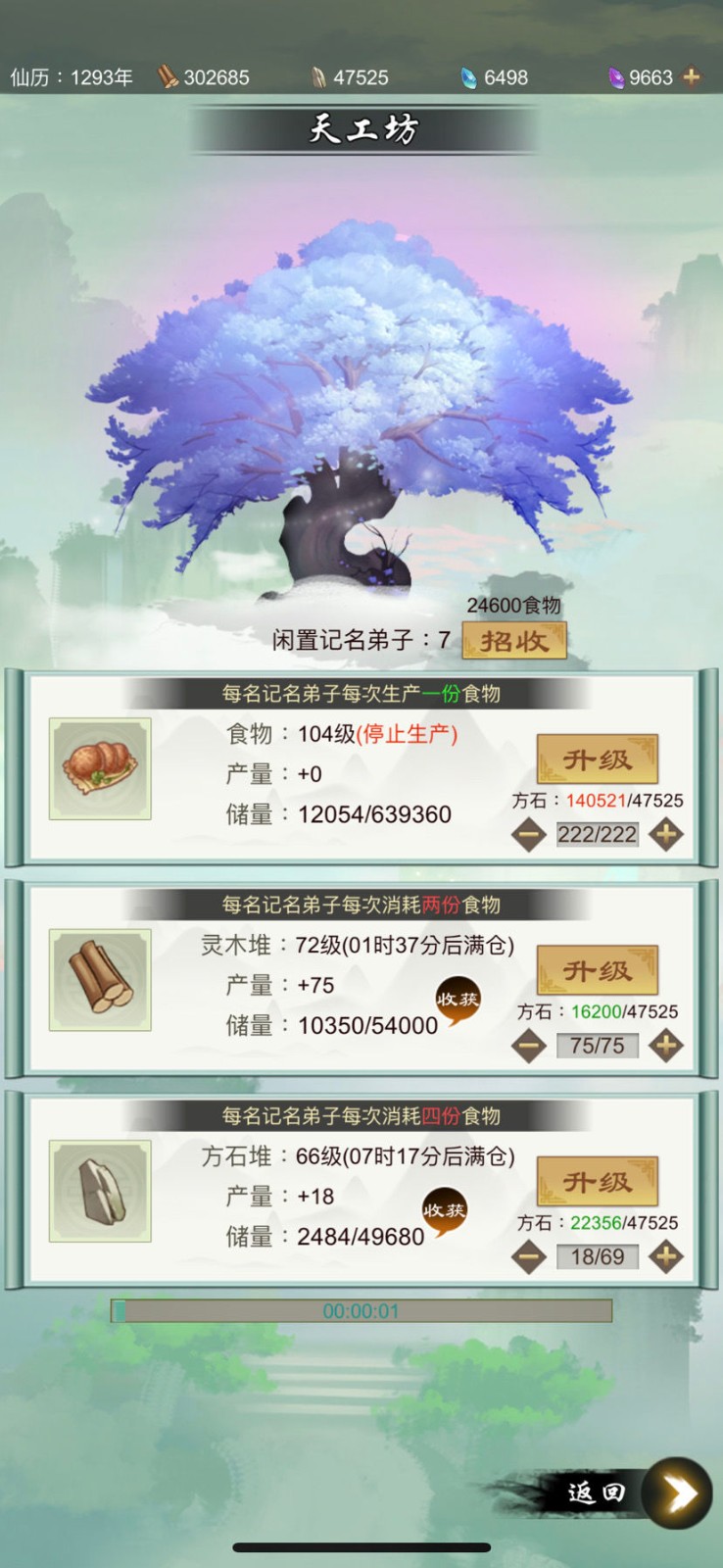 为游戏中获取灵木和方石的主要渠道之一,主要生产食物,灵木以及方石,通过食物来招收额外的记名弟子,然后分配弟子去生产食物,灵木以及方石。