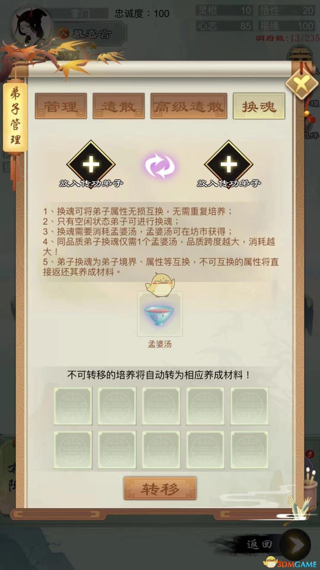 1、换魂可将弟子属性无损互换,无需重复培养;