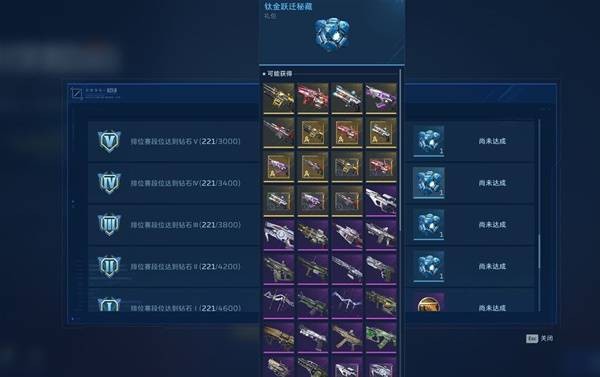 钻石段位从五到二都可以获得一个钛金跃迁秘藏,里面可以开出各种传说级别的武器和史诗级别的武器,有期限也有永久,钻石一可以获得50荣誉点。