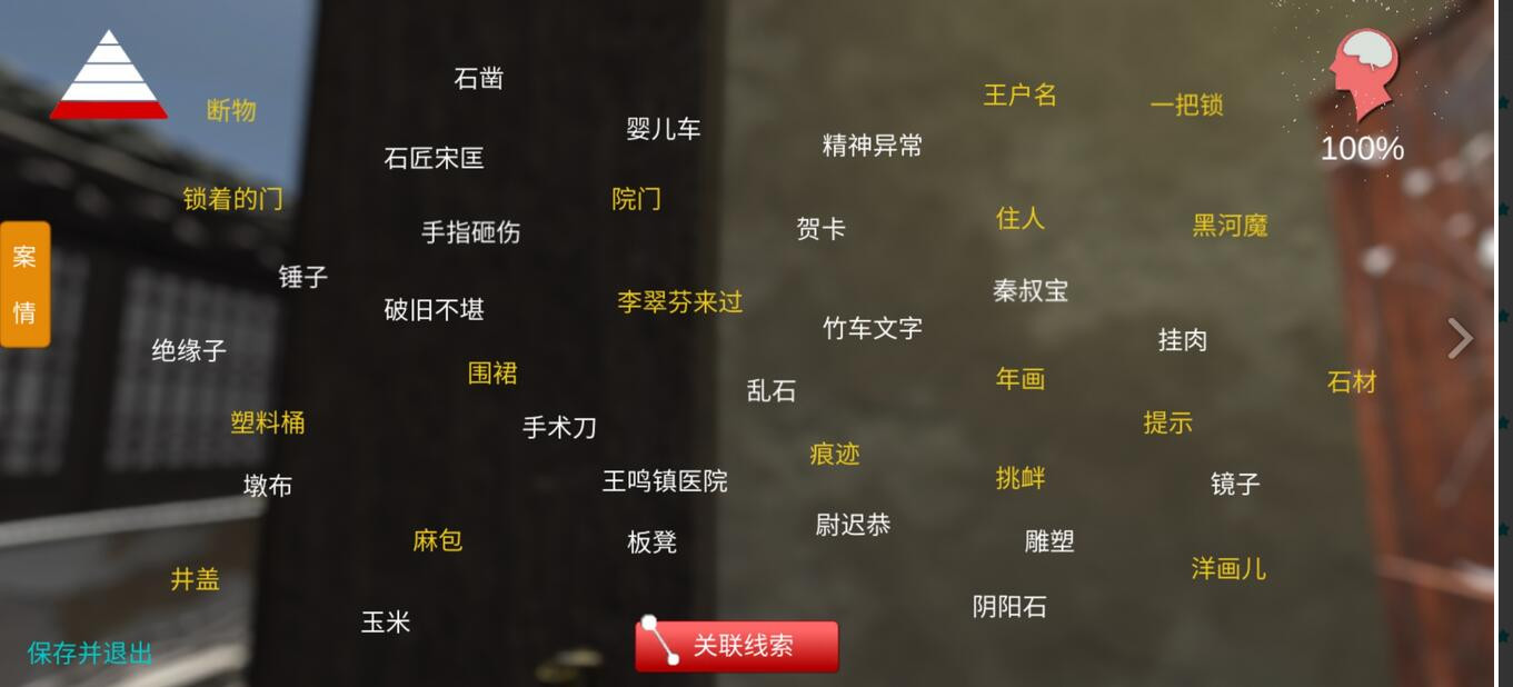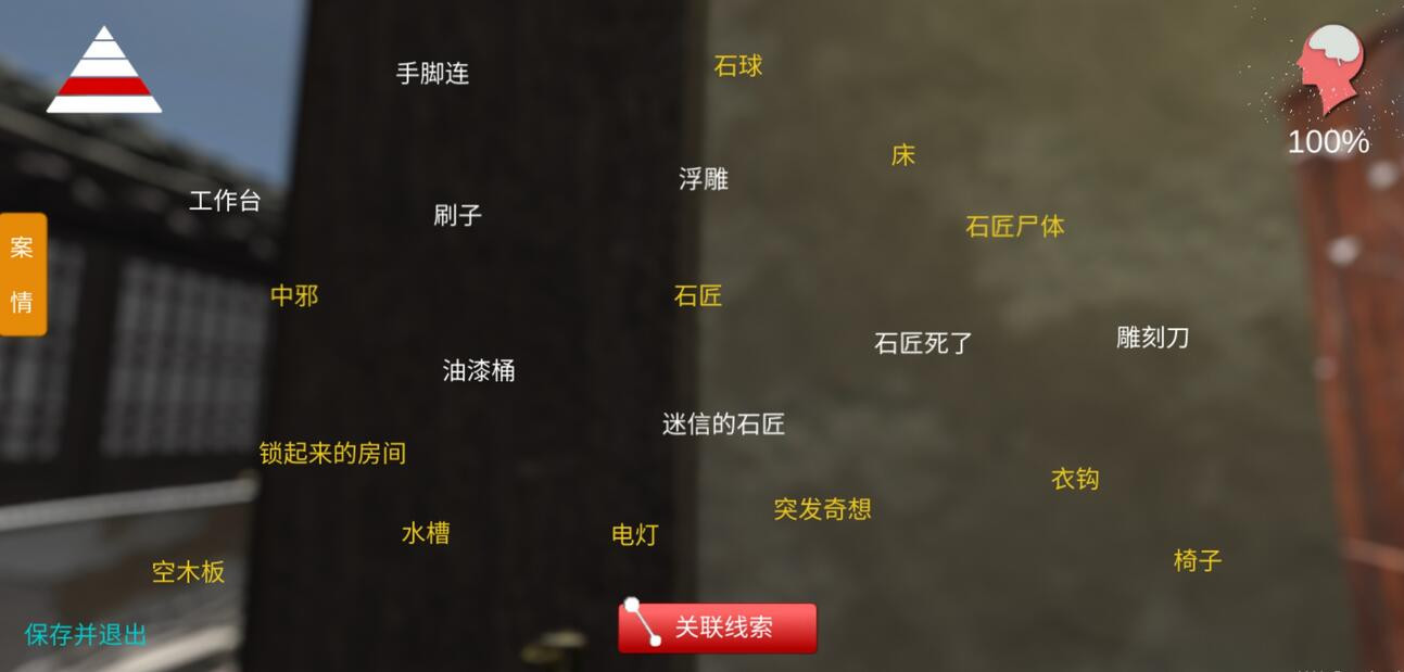 一级线索 真相 专区 二级线索 留言1 留言2 提示1 提示2 提示3 三级线索 过结 皓灵真人 木匠 木匠王维行 同样 我要找到凶手 钥匙 一本书 一幅画 臧家廉 四级线索 床 电灯 雕刻刀 浮雕 工作台 空木板 石匠 石匠死了 石匠尸体 石球 手脚连 刷子 水槽 锁起来的房间 衣钩 椅子 油漆桶 中邪 五级线索 板凳 锤子 雕塑 断手 墩布 挂肉 贺卡 黑河魔 井盖 镜子 精神异常 绝缘子 乱石 麻包 年画 破旧不堪 秦叔宝 石材 石匠宋匡 石凿 手术刀 手指砸伤 塑料桶 锁着的门 提示 挑衅 王户明 王鸣镇医院 围裙 血迹 洋画儿 一把锁 阴阳石 婴儿车 玉米 尉迟恭 院门