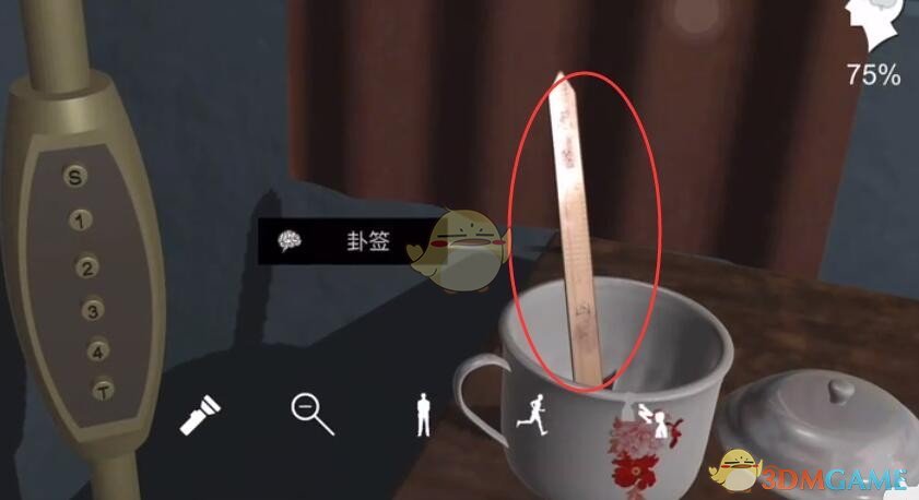 线索详情:坐在沙发上的人面前的杯子里放了一个卦签。