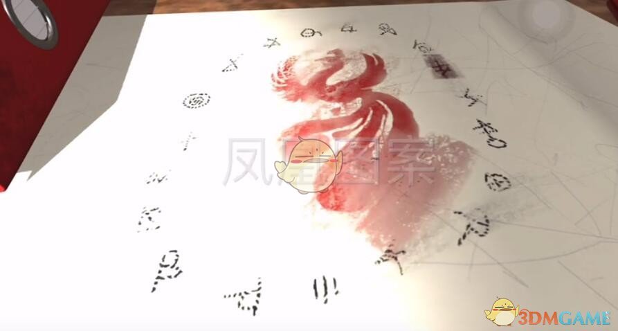 线索详情:桌上有一张纸,上面画了一个凤凰的图案,这个图案很漂亮,我从来没见过,图案周围有一圈奇怪的文字,并且很多地方有故意涂抹的痕迹。
