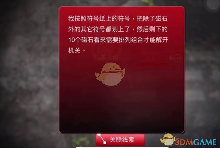 线索详情:我按照符号纸上的符号,把除了磁石外的其它符号都划上了,然后剩下的10个磁石看来需要排列组合才能解开机关。