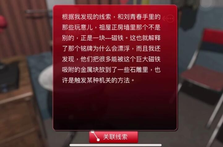 根据我发现的线索, 和刘青春手里的那些玩意儿,祖屋正房墙里那个不是别的,正是一块--磁铁。这也就解释了那个铭牌为什么会漂浮, 而且我还发现,他们把很多能被这个巨大磁铁吸附的金属块放到了一些石雕里,也许是触发某种机关的方法。