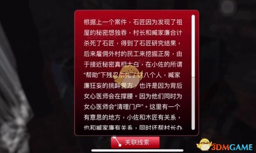 根据上一个案件,石匠因为发现了祖屋的秘密想独吞,村长和臧家廉合计杀死了石匠,得到了石匠研究结果,后来雇佣外村的民工来挖掘正房,由于接近秘密真相大白, 在小佐的所谓“帮助”下残忍杀死了这八个人,臧家廉狂妄的挑衅警方,也许是因为背后女心医师会在撑腰。因为他们同时为女心医师会清理门户”。这里有一个有意思的地方,小佐和木匠有关系,也和臧家廉有关系,同时还帮村长办事,如此卑微的一个女子,怎么会和此案这些重要嫌疑人有千丝万缕的联系呢?她一定是个关键人物。她又是如何“帮助”臧家廉和村长一下杀了这么多人的?我想解开这一切还需要弄清楚祖屋这个墙里的金属到底是干什么的?看看南河那边能不能分析出新花样,这小子黑了吧唧的嘴有点碎,但是脑子还是挺好使的,据说之前也破了不少大案。