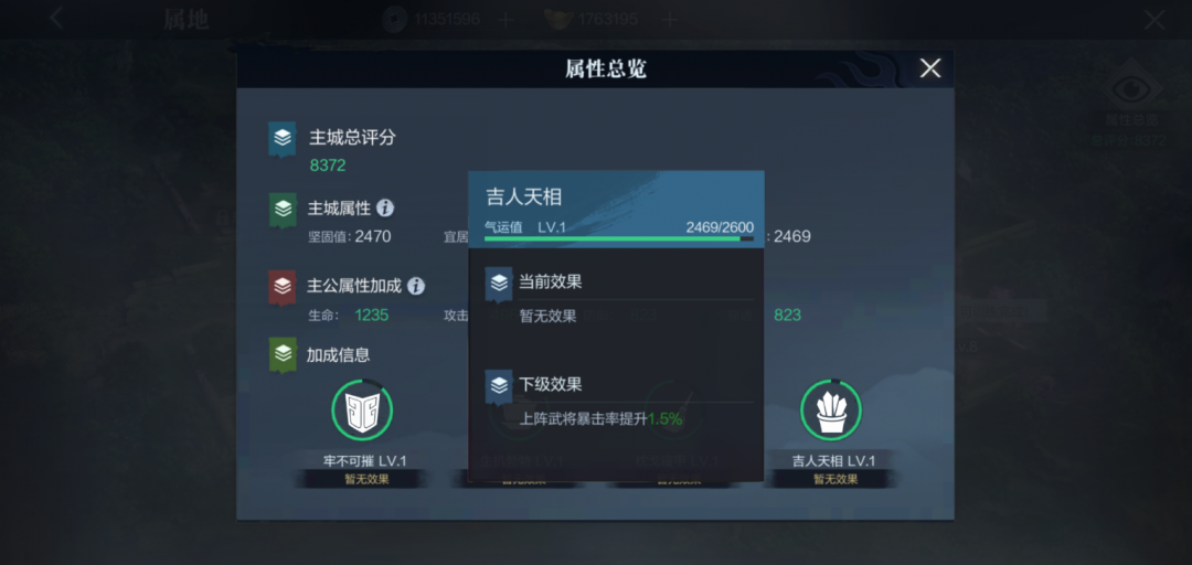 除此之外,建造、升级属地建筑可提升坚固值、宜居值、军备值、气运值属性,可提升主公的生命、攻击、防御和穿透等战斗属性,并额外提供上阵武将的防御力、生命值、攻击力和暴击率。
