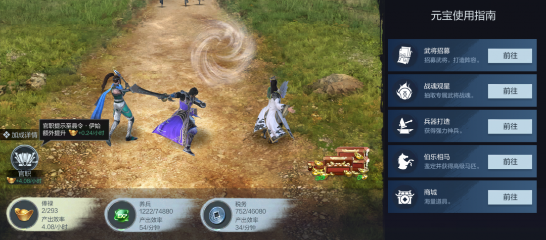 亦可以通过进阶官职,获得招募令、传奇武将碎片等奖励,也可以解锁政务系统,每过一段时间自动产出俸禄、经验和银币,主公升级也能领取到等级礼包,拥有很高的性价比。