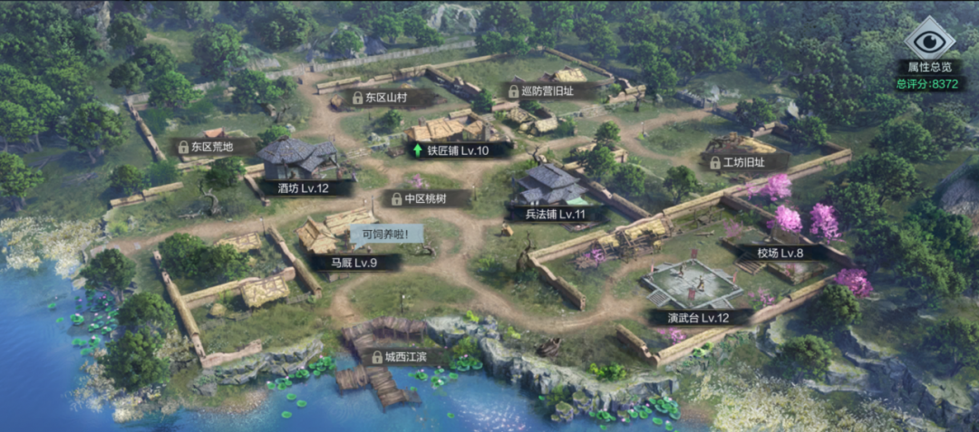 属地模式不同于战场割草玩法,而是类似建设休闲玩法,属地可建设、升级多类建筑,不同的建筑拥有不同的建筑功能,如马厩可饲养、繁育战马;铁匠铺可打造、强化装备;校场可训练武将、提升等级等等。