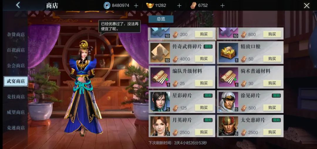 除了段位奖励外,挑战对手可获得铜雀币,可在武宴商店购买武将碎片以及各种基础材料。另外小霸王们不要忘了配置防守阵容,用于防守的武将建议选择通用性比较强的阵容,而进攻乌江镇阵容则可以根据对手的阵容进行一定的调整,更容易获得战斗的胜利。