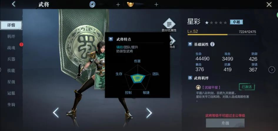 星彩是目前唯二拥有合击技能的【卓越】品质武将,另外一个自然就是她的搭档关平。虽然星彩定位偏向团队,整体属性和伤害加成也不算特别高,但在合击技能的加持下,星彩可在前期爆发出惊人的战力。另外一点,【卓越】品质的星彩相对容易培养,可以很快进阶到高阶,获得大幅度基础属性提升,高阶星彩的实战能力甚至不输于其他【超凡】品质的武将。