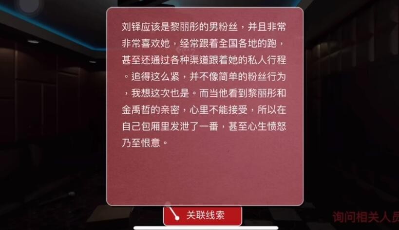 线索详情:刘铎应该是黎丽彤的男粉丝,并且非常非常喜欢她,经常跟着全国各地的跑,甚至还通过各种渠道跟着她的私人行程。追得这么紧,并不像简单的粉丝行为,我想这次也是。而当他看到黎丽彤和金禹哲的亲密,心里不能接受,所以在自己包厢里发泄了一番,甚至心生愤怒乃至恨意。