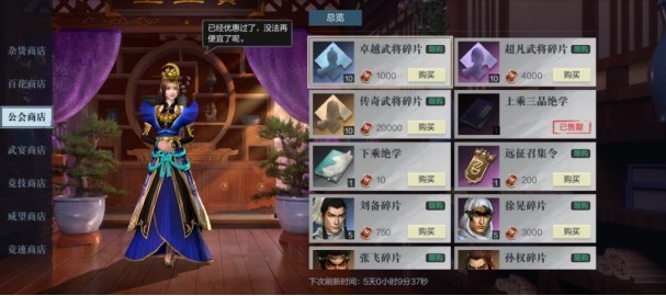 公会商店出售不同品质的武将碎片、下乘绝学、上乘绝学、远征召集令等道具,需要消耗贡献币购买,道具商品每日限量购买,每周刷新一次。
