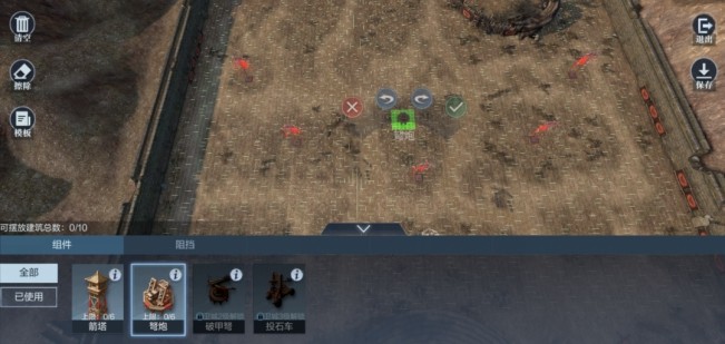 公会成员还可对卫城防御设施进行自定义编辑,可根据战术规划摆放箭塔、弩炮、破甲弩、投石车、条形拒马、城墙、折角拒马等防御建筑。